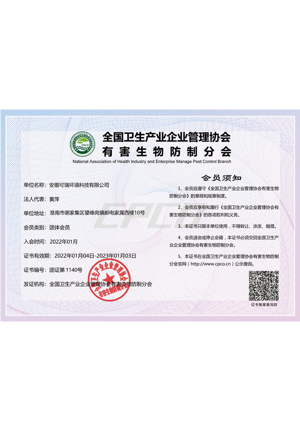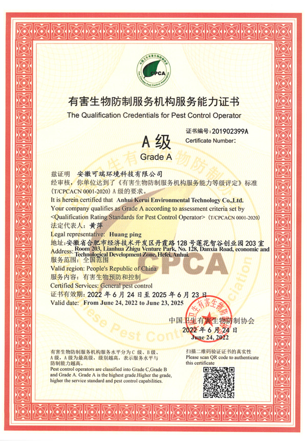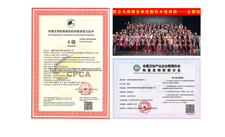 凱瑞蟲控?fù)碛匈|(zhì)量管理體系認(rèn)證、環(huán)境管理體系認(rèn)證、國(guó)家有害生物資質(zhì)等各項(xiàng)證書